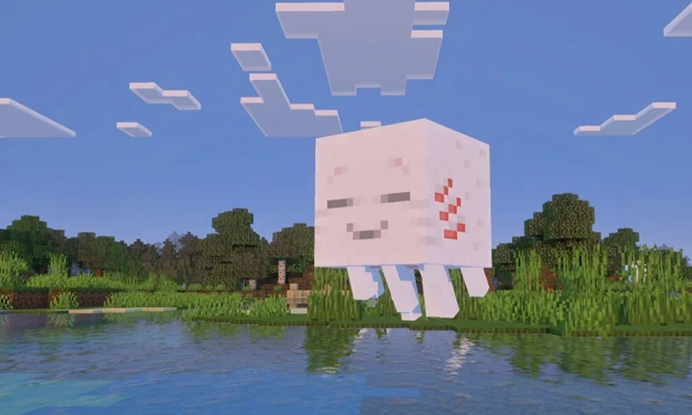 Zurück in der Oberwelt legst du den getrockneten Ghast ins Wasser. Er verwandelt sich langsam in ein Ghastling. Füttere es mit Schneebällen, und mit genug Pflege entwickelt es sich zu einem Happy Ghast. Ist es ausgewachsen, kann dieses Reittier dich und bis zu vier Freunde durch den Himmel von Minecraft tragen.